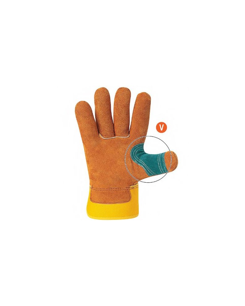 Guantes de protección de palma crupón grado A, dorso y m/textil. Pulgar-índice cosido con hilo kevlar. Costura montada en pulgar. Manipulados metálicos, cerámica, siderurgia, automoción, etc...